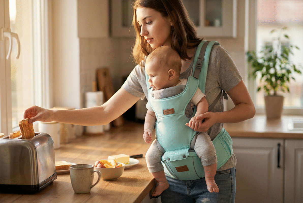 Buổi sáng luôn là khoảng thời gian bận rộn nhất của mẹ: chuẩn bị đồ cho bé, sắp xếp lại nhà cửa, lấy đồ dùng, mở cửa, đón nắng mới… Những bước chân liên tục khiến mẹ dễ mỏi nếu phải bế bé cả buổi sáng. Đây là lúc địu em bé trở thành “trợ thủ nhẹ nhàng” giúp mẹ di chuyển thoải mái hơn rất nhiều.